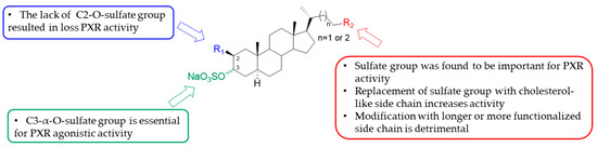 The synthesis of these compounds allowed definition of an SAR (Figure 8). In particular, the length of the side chain bearing the sulfate group had no influence on the binding with PXR, whereas the alcohol derivatives in the side chain lost the ability (decreased the activity) to induce the expression of PXR target genes as well as the absence or inversion of the sulfate group at C-2 in ring A of the steroidal nucleus.