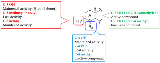 Starting from conicasterol (2), with a significant PXR activating effect in HepG2 transfected cells [19,42], some modification on ring A and on the side chain afforded several 24-methyl semisynthetic derivatives (Figure 11) [21]. The combination of these chemical modifications, biological evaluation, and docking studies provided the molecular bases of ligand/PXR interaction, useful to delineate a preliminary structure–activity relationship.
