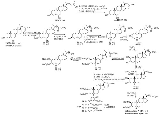 Starting from the commercially available hyodeoxycholic acid (HDCA, 56), Sepe et al. [50] set up a robust synthetic route to prepare solomonsterol A (47) in large amounts. The same synthetic protocol starting from 24-nor-HDCA (57), in turn obtained by one-carbon degradation at C-24 on HDCA (isolated yield of 60% over the three-step sequence, (Scheme 1) [20,50], allowed access to solomonsterol B (48).