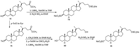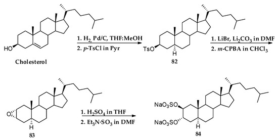 Similar modifications were made on intermediate 61 to speculate on the pharmacophoric role played by the functionalities on ring A in compounds 78 and 81 (Scheme 2), featuring the lack of the sulfate group at C-2 and bearing a 3β- or 3α-sulfate function, respectively. Starting from cholesterol, the same synthetic route used for the total synthesis of solomonsterols afforded cholestane disulfate (84) (Scheme 3) characterized by a hydrophobic side chain [51].