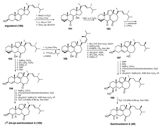 In 2019, Duecker et al. reported, for the first time, the synthesis of swinhoeisterol A (49) from ergosterol by exploiting a radical framework reconstruction [53]. In addition, in 2020, the same authors described in detail the synthetic efforts (Scheme 4) towards the successful route of this unusual sterol and its analogue, Δ22-24-epi-swinhoeisterol A (105) [54]. As reported in Scheme 4, the key steps are the conversion of ergostane skeleton into 13(14→8)diabeo framework using a radical rearrangement of 14-hydroxy intermediate 101, the introduction of campestane-like side chain in derivative 106, and the installation of the 4-exo-methylene moiety via 4-hydroxy-methyl derivative 108, followed by elimination.