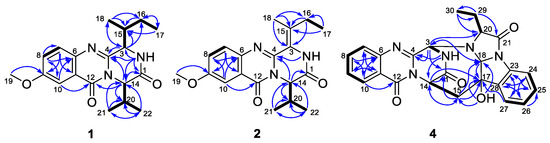 Figure 2. Key COSY (bold lines) and HMBC (blue arrows) correlations for compounds 1, 2, and 4.