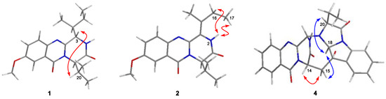 Figure 3. Key NOE correlations for compounds 1, 2, and 4 (red lines: β-orientation; blue lines: α-orientation).