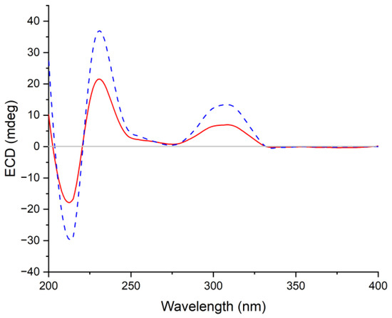 Figure 5. Comparison of the experimental ECD spectra of compounds 3 (in red) and 4 (in blue) in CH3OH.