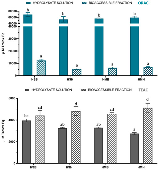Total antioxidant capacity by TEAC and ORAC before and after simulated gastrointestinal digestion in fish protein hydrolysates. TEAC: Trolox Equivalent Antioxidant Capacity. ORAC: Oxygen Radical Absorbance Capacity. Data are expressed as mean ± SD (n = 3 for TEAC and n = 6 for ORAC). Different lowercase letters in the bars indicate statistically significant differences (p < 0.05) among samples.