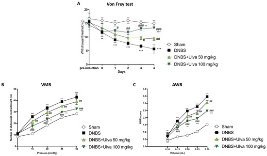 Cytokines and inflammatory mediators enhance the excitability of sensory nerves that carry information from the gut to the brain. For these reasons, inflammation associated with colitis is considered a major cause of abdominal pain [13,14]. To evaluate the effects of Ulva pertusa extract in reducing abdominal pain, the von Frey test was performed. Harmless mechanical stimulation of the abdomen (a measure similar to allodynia) showed a reduced withdrawal response in animals subjected to intrarectal injection of DNBS up to day 5, compared to Sham animals (Figure 1A). Ulva pertusa administration (50–100 mg/kg) in a dose-dependent manner increased the pain threshold, in particular, the highest dose of 100 mg/kg was significantly effective in reducing DNBS-induced hyperalgesia, especially after 4 days of treatment (Figure 1A). Visceral sensitivity was assessed by measuring the visceromotor response (VMR) and abdominal withdrawal reflex (AWR) to colorectal distension (CRD). Five days after DNBS injection, both VMR and AWR were significantly higher than in the Sham group (Figure 1B,C). Oral administration of Ulva pertusa at doses of 50 mg/kg and 100 mg/kg reduced DNBS-induced visceral hypersensitivity (Figure 1B,C). Particularly, the higher dose of 100 mg/kg demonstrated greater efficacy in reducing abdominal pain than the 50 mg/kg dose.