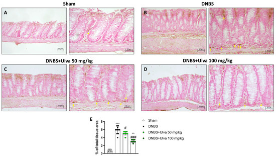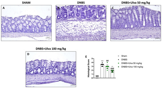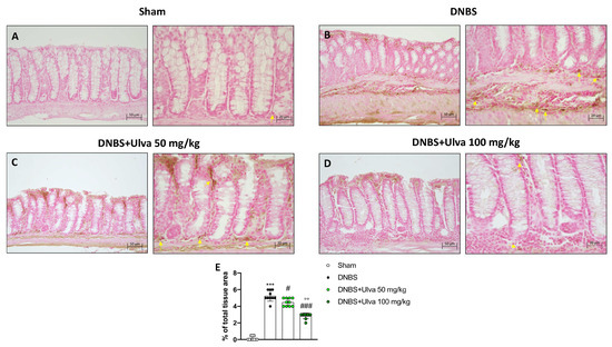 To confirm the success of the DNBS-induced colitis model and the protective effect of Ulva pertusa in counteracting DNBS-induced colitis, as reported in our previous study, colon sections were stained with Hematoxylin and Eosin (H&E). In this new set of experiments, histological results established that rectal instillation of DNBS induced ulcerative colitis in mice by causing histopathological changes in colonic mucosa, also reconfirming Ulva pertusa skills in reversing colonic tissue damage. Indeed, DNBS-treated animals showed histopathological changes characterized by loss of crypt architecture, tissue edema, and a large number of neutrophils in the submucosa layer (Figure 2B,E). Furthermore, in agreement with what was previously demonstrated, oral treatment with Ulva pertusa significantly improved tissue architecture (Figure 2C,E), especially at the higher dose of 100 mg/kg (Figure 2D,E).