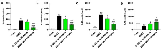 Ulva pertusa administration modulated interleukins after DNBS-induced colitis. Serum levels of the following interleukins have been assessed by ELISA kit: IL-6 (A), IL-17 (B), IL-23 (C), IL-10 (D). In every experimental group the number of mice was n = 10. Values are means ± SD. The one-way ANOVA test was followed by the Bonferroni test. *** p < 0.001 vs. Sham; # p < 0.05 vs. DNBS; ### p < 0.001 vs. DNBS; ° p < 0.05 vs. DNBS+Ulva 50 mg/kg; °° p < 0.01 vs. DNBS+Ulva 50 mg/kg; °°° p < 0.001 vs. DNBS+Ulva 50 mg/kg.
