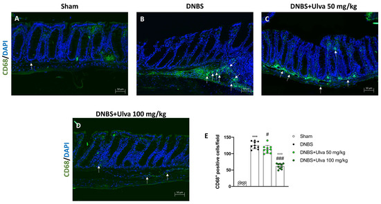 Effect of Ulva pertusa administration on CD68 expression. To assess the amount of CD68+ cells immunofluorescence was performed: Sham group ((A), score (E)), group with DNBS-induced colitis ((B), score (E)), treatment with Ulva pertusa 50 mg/kg ((C), score (E)) and Ulva pertusa 100 mg/kg ((D), score (E)). White arrows indicate the positive staining for CD68+. The results of the immunofluorescence staining were displayed at 20× magnification. In every experimental group the number of mice was n = 10. Values are means ± SD. The one-way ANOVA test was followed by the Bonferroni test. *** p < 0.001 vs. Sham; # p < 0.05 vs. DNBS; ### p < 0.001 vs. DNBS; °°° p < 0.001 vs. DNBS+Ulva 50 mg/kg.