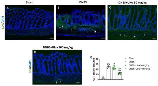 Effect of Ulva pertusa administration on CD4 expression. Immunofluorescence analysis of CD4 in the colon tissues of Sham group ((A), score (E)), DNBS-injected animals ((B), score (E)), mice treated with Ulva pertusa 50 mg/kg ((C), score (E)) and Ulva pertusa 100 mg/kg ((D), score (E)). White arrows indicate the positive staining for CD4. The results of the immunofluorescence staining were displayed at 20× magnification. In every experimental group the number of mice was n = 10. Values are means ± SD. The one-way ANOVA test was followed by the Bonferroni test. *** p < 0.001 vs. Sham; # p < 0.05 vs. DNBS; ### p < 0.001 vs. DNBS; °°° p < 0.001 vs. DNBS+Ulva 50 mg/kg.