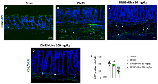 Likewise, DNBS-injected mice showed a high number of CD8+ T-positive cells (Figure 8B,E) if compared to Sham animals (Figure 8A,E). Differently, mice treated with Ulva pertusa revealed a significantly reduced number of CD8+ T-positive cells in a dose-dependent manner (Figure 8C,D,E), thus demonstrating a modulatory effect on T cell adaptive immunity.