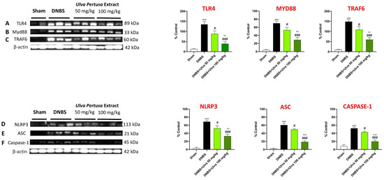 Effect of Ulva pertusa on TLR4 and NLRP3 signaling pathways. Western Blot results of: TLR4 (A), Myd-88 (B), TRAF6 (C), NLRP3 (D), ASC (E), Caspase-1 (F). In every experimental group the number of mice was n = 10. Values are means ± SD. The one-way ANOVA test was followed by the Bonferroni test. *** p < 0.001 vs. Sham; # p < 0.05 vs. DNBS; ### p < 0.001 vs. DNBS; °° p < 0.01 vs. DNBS+Ulva 50 mg/kg; °°° p < 0.001 vs. DNBS+Ulva 50 mg/kg.