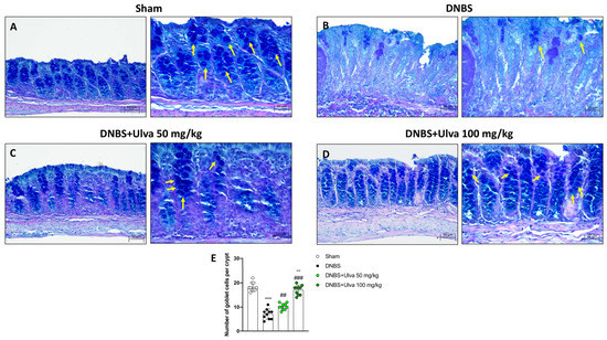 Our results revealed that compared to Sham mice (Figure 10A,E), the number of goblet cells in the colonic crypts of DNBS-injected mice was markedly reduced (Figure 10B,E). In contrast, goblet cells showed almost complete recovery in colonic sections of mice treated with Ulva pertusa 50 mg/kg and 100 mg/kg (Figure 10C,E and Figure 10D,E, respectively). Thus, as the TLR4 pathway impairs goblet cells in IBD, these findings confirm a protective role of Ulva pertusa that may be closely related to TLR4 signaling.
