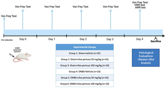 Group 6: DNBS+Ulva pertusa 100 mg/kg: mice subjected to DNBS-colitis induction, then administered with Ulva pertusa extract 100 mg/kg by oral gavage every 24 h for 4 days, starting from 3 h after the DNBS instillation (N = 10).