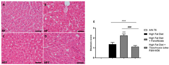 Hematoxylin and eosin staining for histopathological analysis of rat hepatic tissues: (A) NF group; (B) HF group; (C) HFF group; (D) HFT group, scale bar 400× magnification; (E) steatosis score. Normal diet (NF), high-fat diet (HF), high-fat diet + fenofibrate (HFF), and high-fat diet + T. lutea F&M-M36 (HFF). Data are expressed as means ± SE; n = 8 rats/group. ^^^ p < 0.001 vs. NF; *** p < 0.001 vs. HF; ### p < 0.001 vs. HFF, by one-way ANOVA and Dunnett’s multiple comparisons test.
