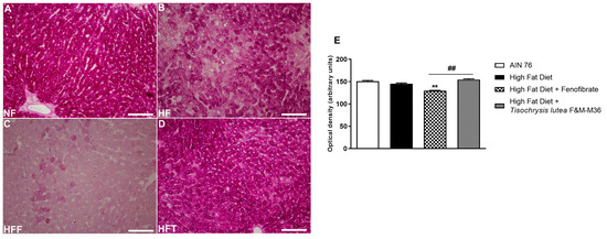 As shown in Figure 2, the HF diet did not modify glycogen storage determined by periodic acid–Schiff (PAS) glycogen staining, compared to the NF diet. Fenofibrate but not T. lutea significantly decreased hepatic glycogen levels, compared to the HF diet (p < 0.01).