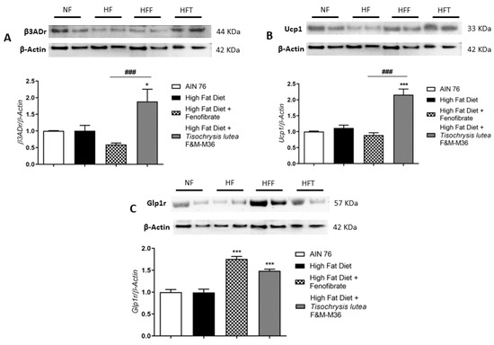 Effect of fenofibrate and T. lutea F&M-M36 on type 3 beta adrenergic receptors (β3ADr, (A)), Uncoupling Protein 1 (Ucp1, (B)) and Glucagon-like peptide-1 receptor (Glp1r, (C)) protein expression in visceral adipose tissue by Western-blot analysis. Representative gel images loaded with proteins obtained from two different samples for each experimental group. Normal diet (NF), high-fat diet (HF), high-fat diet + fenofibrate (HFF), and high-fat diet + T. lutea F&M-M36 (HFF). Densitometric analysis is expressed as mean ± SE; n = 8 rats/group. * p < 0.05 and *** p < 0.001 vs. HF; ### p < 0.001 vs. HFF by one-way ANOVA and Dunnett’s multiple comparisons test.
