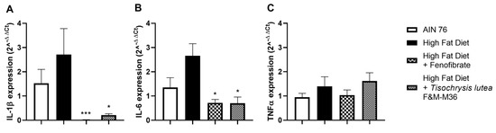 As shown in Figure 4, the HF diet slightly induced the mRNA expression of interleukin 1 beta (IL-1β, Figure 4A) interleukin-6 (IL-6, Figure 4B) while not affecting tumor necrosis factor alpha (TNFα, Panel C) compared to the NF diet. Fenofibrate and T. lutea F&M-M36 significantly reduced Il-1β (p < 0.001 and p < 0.05, respectively) and IL-6 (p < 0.05 for both) compared to the HF (Figure 4A,B).