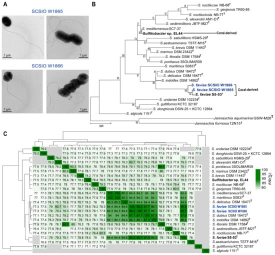 Two cultures, SCSIO W1865 (isolated from black coral Dendrobathypathes sp. at the depth of 1059 m) and SCSIO W1866 (isolated from black coral Telopathes sp. at the depth of 1072 m), were observed under the transmission electron microscope (TEM). Both SCSIO 1865 and SCSIO 1866 were ovoid or rod-shaped (approximately 0.7–2 µm in diameter) bacteria with long single polar flagella (~4–5 µm in length), which may help them swim in liquid environments (Figure 1A). Sequences of 16S rRNA genes from the two cultures showed ~99% similarity to Sulfitobacter faviae S5-53T isolated from the brain coral Favia veroni in the Andaman Sea, India. Phylogenetic analysis of both 16S rRNA genes (Figure 1B) and the whole genome (Figure S1) with 22 other Sulfitobacter spp. also showed that SCSIO W1865 and SCSIO W1866 fell in the clade with Sulfitobacter faviae. Further analysis based on average nucleotide identity (ANI) across whole genome sequences showed that SCSIO W1865 and SCSIO W1866 shared 95.98% and 95.79% ANI values with S. faviae S5-53T, respectively, suggesting that SCSIO W1865 and SCSIO W1866 both belong to S. faviae. Thus, the two strains were identified as Sulfitobacter faviae SCSIO W1865 and SCSIO W1866 (Figure 1C).