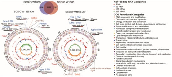 Comparative genomic analysis of SCSIO W1865 and SCSIO W1866. The Venn diagram illustrates the core genes and strain-specific genes between SCSIO W1865 and SCSIO W1866 (upper panel). The annotation of the chromosomes of SCSIO W1865 and SCSIO W1866 is also shown (lower panel). The seven rings from outermost to innermost indicate scale marks of the genome: protein-coding genes on the forward strand, protein-coding genes on the reverse strand, rRNA, tRNA, GC content, and GC skew. The putative toxin-antitoxin (TA) pairs are shown in brown letters, while the orphan toxins and antitoxins are shown in red and orange letters, respectively. The other antiphage systems are shown in blue letters.
