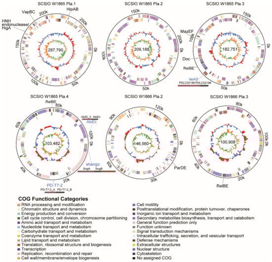 The four megaplasmids in SCSIO W1865 encoded 276, 192, 188, and 98 CDSs, and the three megaplasmids in SCSIO W1866 encoded 195, 152, and 116 CDSs (Table 1). Two plasmids were highly similar in the two strains (~96% identity), and the rest were unique (Figure 3 and Figure S2). Functional analysis of the genes encoded by the megaplasmids in each strain was performed, and similar GO (Gene Ontology) pathways were annotated, including metabolic processes related to phosphorus, carbohydrate, nitrogen compounds, and urea; responses to stimulation including ion, osmotic stress, and oxidative stress; and some other pathways, especially those involved in defense mechanisms and motility (Figure S3). SCSIO W1865 megaplasmids encoded genes with specific molecular functions in ATP-dependent activity and molecular transducer activity (Figure S3). These results suggested that the megaplasmids in the two strains regulated physiological processes and competition with other bacteria in the environment through different genes that are involved in similar important pathways.