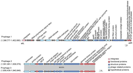 Here, we searched for prophage candidates in both the SCSIO W1865 and SCSIO W1866 genomes using PHASTER []. In SCSIO W1865, two prophages were found, Prophage 1 of 55.8 kb and Prophage 2 of 17.5 kb, while in SCSIO W1866, only one prophage (Prophage 3) was found that shares a high level of similarity with Prophage 2 (96.03%) in SCSIO W1865 (Figure 4). By searching phage genomes in the NCBI virus database, no similar phage sequences were obtained for prophages 1–3, suggesting that they may be prophages that were not identified previously. To further validate this, the major capsid proteins (MCPs) and terminases were also searched, and they all showed similarities (~50% identity) to those of Myoviridae phages. Prophage 1 was integrated downstream of the tRNAser-encoding gene with two identical attachment sites, 5′-CGCGCGCCACCGCC-3′, and the insertion of Prophage 1 generated a gene encoding dTDP-glucose 4,6-dehydratase; thus, the excision of prophage 1 will lead to the disruption of the coding region of this gene. Prophages 2 and 3 share high similarity and were inserted at the same sites, the intergenic region between murein endolytic transglycosylase MltG and the pyruvate dehydrogenase E1 component alpha subunit, but no known integrase was identified.