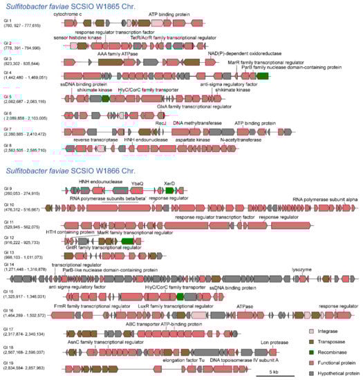 We have reported that mobile GI mediates the competition between coral microbial populations []. Here, we predicted the presence of potential GIs on both chromosomes using IslandViewer 4 []. As a result, eight distinct GIs were predicted in SCSIO W1865 (GI 1–8) and eleven distinct GIs were predicted in SCSIO W1866 (GI 9–19), respectively (Figure 5). These GIs encoded a series of functional genes, including ATP binding protein (GI 1, GI 7), kinase (GI 2, GI 5, GI 8), AAA family ATPase (GI 3), ssDNA specific exonuclease RecJ (GI 7), DNA methyltransferase (GI 7), N-acetyltransferase (GI 8), reverse transcriptase (GI 8), HNH endonuclease (GI 8, GI 9), transcriptional regulators (GI 2, GI 4 to 6, GI 9, GI 12 to 14, GI 16 to 18), RNA polymerase subunits (GI 10), response related genes (GI 11, GI 16), lysozyme (GI 14), anti-sigma regulatory factor (GI 15), Lon protease (GI 18), elongation factor Tu (GI 19), and DNA topoisomerase IV subunit (GI 19). These genes can be involved in host physiology at the transcriptional, translational, and posttranslational levels. In addition, some GIs encode their own integrases/recombinases/transposases, which may mediate their mobility among bacteria and thus affect their physiological and ecological roles.