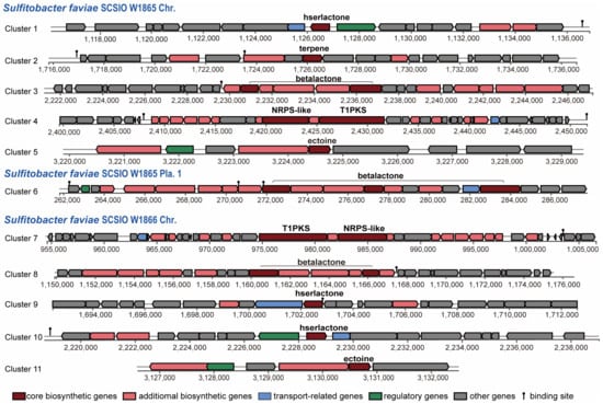 Since more than 200 novel chemical structures have been described annually [], corals and their associated microbial communities have been considered prolific reservoirs of bioactive natural products. Many natural products obtained from the coral holobiont possess potent antibacterial, antiviral, anticancer, anti-inflammatory, antimalarial, and neuroprotective properties [,] and are thus of enormous potential for the blue economy sector []. Gorgonian coral Eunicella labiate-derived Sulfitobacter sp. EL44 is able to inhibit the growth of four fungal pathogens of the Candida genus and possesses several secondary metabolite biosynthetic gene clusters (SM-BGCs), such as ectoine, T1PKS (type I polyketide synthases), and hserlactone BGCs []. To predict the SM-BGCs of S. faviae SCSIO W1865 and SCSIO W1865, the whole genome sequences were uploaded to an-tiSMASH 7 beta. S. faviae SCSIO W1865 and SCSIO W1865 possessed at least seven and six putative SM-BGCs, respectively (Figure 6). Both of them harbor an ectoine cluster that may help microorganisms survive a myriad of environmental stresses by involving them in osmoregulation [] and a T1PKS (type I polyketide synthases)-NRPS (non-ribosomal peptide synthase)-like hybrid cluster, which is often detected in bacteria and fungi and is involved in the biosynthesis of oligopeptides and polyketides []. β-lactone BGCs (two in SCSIO W1865) and hserlactone BGCs (two in SCSIO W1866) were found in the genomes of both strains. In addition to the above shared polyketide synthesis-related cluster, one terpene, SM-BGC, which may also serve as a chemical defense to protect coral from predators [], was specifically found in SCSIO W1865.