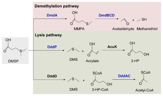 - Li, C.Y.; Wang, X.J.; Chen, X.L.; Sheng, Q.; Zhang, S.; Wang, P.; Quareshy, M.; Rihtman, B.; Shao, X.; Gao, C.; et al. A novel ATP dependent dimethylsulfoniopropionate lyase in bacteria that releases dimethyl sulfide and acryloyl-CoA. eLife 2021, 10, e64045. [Google Scholar] [CrossRef]