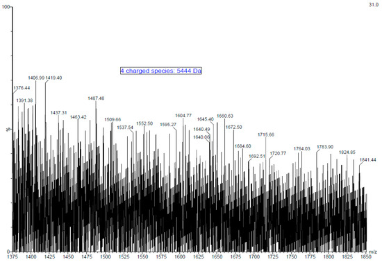 Fucoidan is a large molecule with polydispersity and high molecular weight. The electrospray ionisation mass spectra (ESI-MS) of fucoidan obtained from the MWCO fraction of A. nodosum was measured and a typical mass spectrum of the fucoidan molecule is presented in Figure 1. Signals of high intensity were obtained as expected due to the presence of sulphate groups. Furthermore, numerous peaks distributed throughout the spectrum reveal the heterogeneous nature of the fucoidan molecule. Furthermore, the complexity of the spectrum is augmented by the ability of the poly-sulphated oligosaccharide to form multiply charged ions. The oligosaccharide size ranged from mono to tetrafucose with usually one sulphate group per fucosyl unit. Monosulphated fucose units can be identified by at m/z of 243 [M-H]−, whereas disulphated fucose is represented by m/z of 161 [M-2H]2− by negative ion mode [38]. The presence of species such as trisulphated trifucose and tetrasulphated tetrafucose was not identified probably due to the bulky nature of the molecule and the presence of impurities. Quadruply ([M+4H]4+) and triply ([M+3H]3+) charged fucoidan moieties were identified by m/z peaks at 1376 and 1824, respectively. The molecular mass of the fucoidan molecule purified from A. nodosum was determined to be 5444 Da (~5.4 kDa) based on these multiply charged species. Most literature available on fucoidan deals with a low molecular weight form of the polysaccharide. For example, Li, et al. [39] reported the extraction of fucoidan from A. nodosum with a molecular weight of 3090 Da. Recently, Okolie et al. [21] extracted fucoidan from A. nodosum using a number of extraction methods and reported molecular weight values of 2.7 kDa–136.3 kDa. The difference in the molecular weight of fucoidan is mainly attributed to seaweed species, harvesting location, seasonal variation, climatic conditions, and extraction/purification method used [10,40,41]. Several studies that involve the characterisation of fucoidan by mass spectroscopy perform hydrolysis of the molecule. However, hydrolysis steps were overlooked, as the morale behind performing mass spectroscopy of the purified fucoidan was to identify its molecular weight and thus beyond the scope of this work. The molecular weight of seaweed purified polysaccharides plays a key role in biological activity, and this was the main focus in determining the same [42]. For example, in a recent study, Miyazaki, et al. [43] reported that high molecular weight fucoidan induces anti-tumour immune function in cells. In another significant study, researchers were able to successfully restore the natural killer cell cytotoxicity and granzyme B in addition to increasing the expression of interleukins and tumour necrosis factor in immunosuppressed mice with the aid of high molecular weight fucoidan derived from Undaria pinnatifida [44].