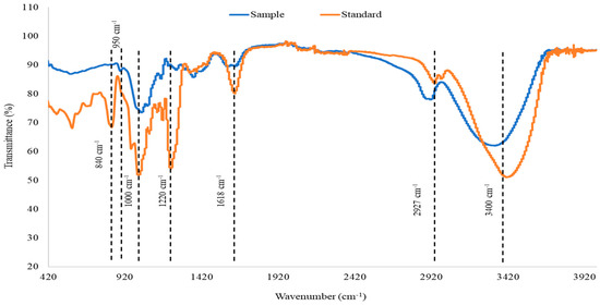 The purified MWCO Fraction was further analysed by employing FTIR spectroscopy. The FTIR spectra of the purified fucoidan and commercial fucoidan from F. vesiculosus are presented in Figure 2. Both sample and commercial standard exhibited O-H stretching and C-H stretching which are represented by bands at around 3400 cm−1 and 2920 cm−1, respectively. However, the C-H stretching was more prominent in the fucoidan obtained from A. nodosum compared to the standard. The peak at 1618 cm−1 signifies carbonyl groups that form uronic acid. The intensity of this peak was significantly higher in the standard as compared to the control. Uronic acid is one of the building blocks of fucoidan, and the levels of this component may vary based on the seaweed species [45]. Fucoidan contains ester sulphate which is detected in the IR spectra as a peak at 1220–1230 cm−1 which is attributed to S=O stretching. Fucoidan extracted from A. nodosum appeared to have a lesser amount of ester sulphate compared to the standard. Transmittance at 1000–1100 cm−1 is an indication of the presence of polysaccharides exhibited by C-O stretching. In fucoidan, this peak is contributed by the presence of glucuronic acid which is another component that forms the polysaccharide. A left shift in this peak indicates the presence of short chains that are highly polar. Such an observation may be made for fucoidan which was purified from A. nodosum. The presence of glucuronic acid may be the underlying reason for the high polarity. Peaks at 840 cm−1 and 850 cm−1 are indicative of sulphate groups in fucoidan. Commercial fucoidan standard exhibited a peak at 840 cm−1. However, this peak was absent in fucoidan purified from A. nodosum. Instead, a small peak was observed at 950–960 cm−1 which showed the presence of the asymmetrical stretching vibration of C–O–S bonds.