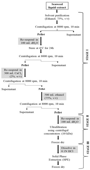 Fucoidan was purified by adopting a multi-step (three-step) protocol developed for laminarin purification earlier [23]. The steps undertaken for the purification of fucoidan from the crude extract are presented in Figure 3.