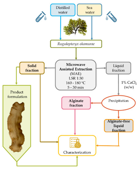 The aqueous extraction operating under pressurized conditions with microwave heating can be proposed as a first stage for the fractionation of R. okamurae biomass (Figure 1). This approach has previously been selected for the extraction of bioactive compounds from other brown seaweeds [23,24,25].