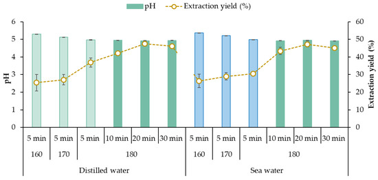 The extraction was performed using a microwave reactor (Anton Paar Monowave 450, Austria). The ground seaweed was introduced with distilled or sea water in the vials using a solid/liquid ratio of 1:30 (w/w) following a previous work [37]. The samples were heated until the selected temperature, which was kept for 5 min at 800 rpm and 850 W prior to cooling down to 50 °C. The extraction temperatures were 160 °C, 170 °C, and 180 °C. Longer extraction times (up to 30 min) were assessed at the temperature conditions that led to the best extraction results. Liquid and solid phases were split by vacuum filtration. The solid phases or solid residue were dried and stored at room temperature.