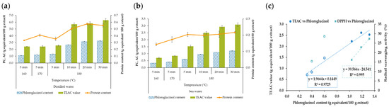 Effect of the processing conditions on the phloroglucinol content (PC), antioxidant activity (AC, such as TEAC and DPPH values), and protein content of the liquid fraction obtained after hydrothermal treatment of R. okamurae using different solvents: (a) distilled water and (b) sea water. (c) Correlation between the PC and the AC of the soluble extracts obtained with distilled (filled symbols) and with sea (open symbols) water. Data represent mean ± standard deviation (n ≥ 3).