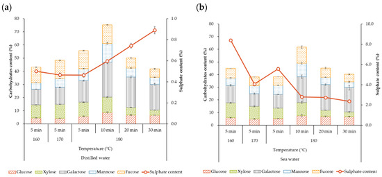 Effect of temperatures and solvents ((a) distilled water and (b) sea water) during microwave-assisted hydrothermal extraction on the oligosaccharide composition of the liquid fractions obtained from R. okamurae and further dialyzed in 0.5 kDa membranes.