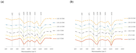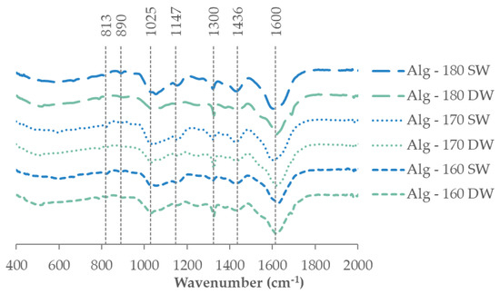 Data in Figure 5 confirm the presence of sulfate ester bonds at 1249 and 873 cm−1 for samples extracted in the presence of distillate water independently of the microwave processing temperature, describing an asymmetrical S=O stretching vibration [35]. All profiles exhibited a major band around 1600 cm−1 typically present in the alginate fractions related to the uronic acids. Those recovered using distillate water also presented a band at 1029 cm−1 related to the C-O and C-C stretching vibrations of pyranoses, whereas this band was shifted to 1150 cm−1 for crude extracts separated using sea water as an extractive agent. The molecular weight of the solubilized polysaccharides is higher than 300 kDa, with the signal from the peaks corresponding to treatments with salt water being more intense with higher molecular weights than those from distilled water treatments (Figure S1).