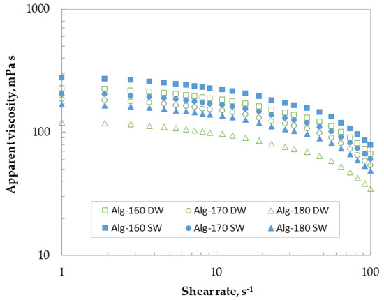Figure 7 shows the corresponding viscous profiles at 25 °C of the above alginates, extracted after 5 min of hydrothermal treatment, with a commonly used biopolymer content (2%), confirming the hypothesis made with the structural properties. It should be noteworthy that no differences were found with those extracted at higher hydrothermal extraction times. At a fixed shear rate, the apparent viscosity was higher for alginates extracted using sea water than for those processed at the same temperature with distilled water. The highest viscosity values were identified for Alg-160 SW followed by Alg-170 SW (Alg-160 DW) > Alg-180 SW (Alg-170 DW) > Alg-180 DW. At low shear rates, alginate recovered after hydrothermal treatment with both extractive agents showed a Newtonian plateau. In all cases, a shear-thinning behavior was observed above 5 s−1. It should be noted that no hysteresis loops were identified in tested alginates. The measured viscosity values were almost half those reported for commercial alginate solutions at similar biopolymer content, but in the range of those found for other crude alginates [39,47].