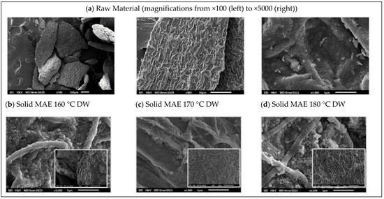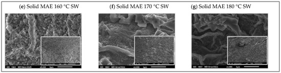 SEM images of R. okamurae raw material with different magnifications (a) and the corresponding residual solids after microwave-assisted hydrothermal treatment at different processing conditions with distilled water (b–d) and with salt water (e–g).