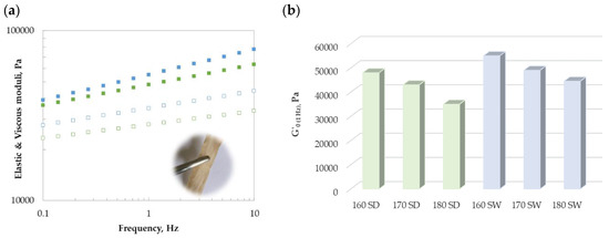 The potential of solid residue for the development of biomaterials was also studied based on the results previously found for wild R. okamurae alga blended with glycerol [18]. Figure 9a shows the viscoelastic profiles obtained for the blends before printing treatment. In all cases, the elastic behavior prevailed over the viscous one, confirming the marked elastic character. A slight frequency dependence was observed in both moduli with a slope around 0.15 ± 0.03 for G′ and about 0.10 ± 0.02 for G″. These dependences are like those previously reported for the blends with the wild seaweed, with an elastic modulus frequency slope of 0.25 before and 0.16 after the heat treatment [18]. Although, the magnitude of both moduli was lower for the blends with the solid residue (about two decades) when compared with the data previously reported for later authors. At a fixed frequency, systems made with solid residues from sea water treatment exhibited higher values than those recovered after distilled water processing (Figure 9b). The strongest viscoelastic features were observed for those prepared with 160 SW followed by 170 SW (160 DW) > 180 SW (170 DW) > 180 DW. These preliminary results evidence the suitability of proposed processing methods for these blends. Further studies are necessary to optimize the mechanical properties of the developed bio-based materials from R. okamurae depending on their final application from control–release to food packaging.