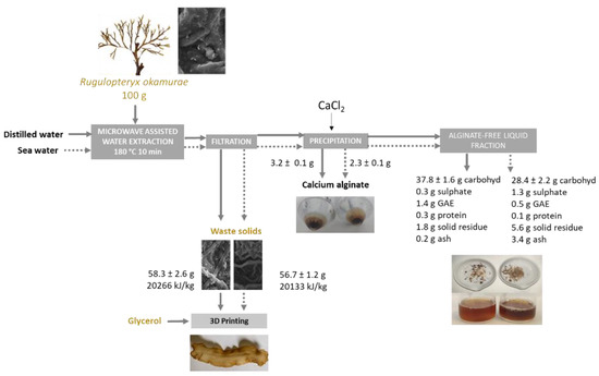 Operating under optimal microwave-assisted hydrothermal conditions (180 °C, 10 min), the major seaweed fraction remains insoluble, up to 3 g alginate/100 g seaweed could be obtained by CaCl2 precipitation, and a product with up to 75 and 62 g galactofucans/100 g extract could be obtained when distilled and sea water were used, respectively (Figure 10).