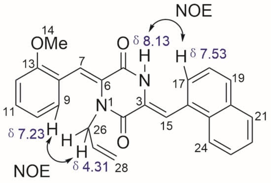 Compound 11 was selected as a representative compound to verify the correct structure of this kind of product based on its NMR and HRMS results (Figure 3). The 1H NMR spectrum displayed that there are eleven aromatic proton signals (δH 8.01–8.00, H-24; 7.88–7.86, H-21; 7.85, H-19; 7.56–7.50, H-23, H-22, H-17, H-18; 7.37–7.35, H-11; 7.25, H-9; 7.00, H-10; 6.93, H-12). Note that one alkene terminal proton signal is overlapped (δH 7.56–7.50, H-15), and the other alkene terminal proton signal is at 7.30 for H-7. The δH values ranging from 5.61 to 4.31 are signals of allyl, and the signal of the methoxyl group is at 3.87. The 13C NMR spectrum showed that two amide carbon signals (δC 159.8 and 158.9) and one aromatic carbon (C-13, adjacent to the methoxyl group) signal (δC 157.3) are in the far low-field. There are twenty-one carbons signals (δC 133.8–110.6), which belong to the groups of naphthalene (10 carbons), benzene (5 carbons), and three C–C double bonds (6 carbons). The HRMS (ESI) result confirmed the correct molecular formula C26H23N2O3 (m/z 411.1696 [M + H]+) for this compound. The 2D NMR (NOESY) spectrum displayed that the 1H–1H correlations occurred between the H-9 (δH 7.23) and H-26 (δH 4.31), H-4 (δH 8.13) and H-17 (δH 7.53) bonds (please see Figure S29 in Supplementary Materials), which indicates the correct stereo-configuration for the 3Z,6Z-isomer and is similar to those in the previous studies [12,28].