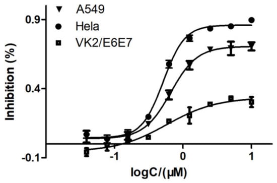 Relationships between the inhibition and the concentration of compound 11 for two cancer cell lines (A549 and Hela) and a normal cell line (VK2/E6E7). All results are presented as mean ± standard deviation (SD) from three parallel experiments.