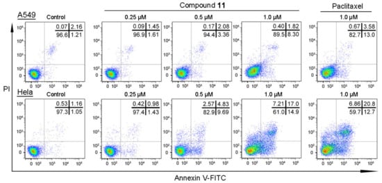 Previous studies demonstrated that 3,6-diunsaturated 2,5-DKPs with anticancer properties showed a phenotype characteristic of inducing apoptosis in cancer cells. For example, the synthetic plinabulin with a side imidazole component could induce apoptosis in multiple myeloma cells [29]. Our former synthetic compound 3c with lipidic side alkyl chain could also induce apoptosis in U937 cells with dose- and time-dependent relationships [30]. Therefore, the abilities of compound 11 to induce apoptosis in both cell lines were evaluated using flow cytometry with Annexin V-FITC and PI dual staining. As shown in Figure 5, compound 11 could obviously induce apoptosis in both cells at 1.0 μM after 48 h of treatment in comparison with the untreated controls. Note that cell death occurred in both early and late stages. Dose-dependent effects of compound 11 on the induction of apoptosis in both cells were observed, especially for Hela cells, indicating that Hela cells were more sensitive to this compound, which is consistent with the MTT results that compound 11 had a stronger inhibitory ability against Hela than A549. Surprisingly, necrosis characterized by a positive correlation between the amount and the treated concentrations of compound 11 in Hela cells was also found, implying this compound might simultaneously work through other unknown pathways to induce cell death, and similar results were also found in a former study that focused on a deuterated plinabulin [31].