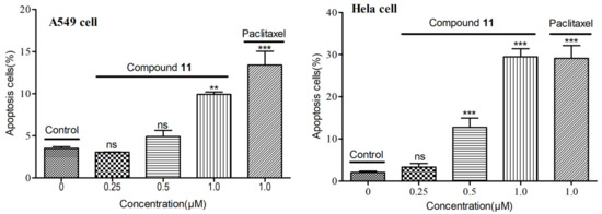 Compound 11 induced apoptosis in A549 and Hela cancer cells. PBS (pH 7.4) containing DMSO (1‰) was used as a negative control, and paclitaxel was used as a positive control. All results were presented as mean ± standard deviation (SD). “ns” means no statistical differences; ** p < 0.01, *** p < 0.001, Student’s t-test.