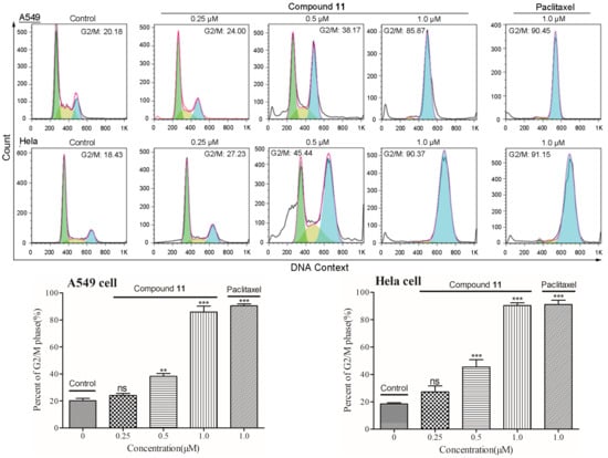 Cell cycle arrest experiments were also performed to investigate which phase of the cell cycle progression was blocked by compound 11. As shown in Figure 6, compound 11 could arrest both cancer cells in the G2/M phases, and the cell contents increased following the concentration gradients. Compound 11 also showed a stronger potency to arrest the Hela cells than A549 cells, consistent with the above MTT and apoptosis results. Compared to the untreated controls, major peak distributions for the G2/M phases could be found when cells were treated with 0.5 μM, and the cell cycle progression could be almost blocked at the G2/M phase with percentages of 85.87 (A549) and 90.37% (Hela), respectively, when treated with 1.0 μM for 24 h. The results were similar to the cell cycles blocked by the positive control paclitaxel, indicating our derivative may have the same biological targets, such as tubulin, as paclitaxel [32], while their binding modes and regulating functions might be different. It was documented in previous studies that paclitaxel bound to the microtubule at the taxoid site on the luminal face of β-tubulin and maintained the stability and destroyed the dynamics of the microtubule, thus leading to mitotic catastrophe [33]. However, according to the “similarity principle” [34], our 2,5-DKPs might have the same mechanism as plinabulin or its analogs, which acted as a tubulin binder near or at the colchicine binding site located at the interfacial region of the α- and β-tubulin studied using photoaffinity labeling [35,36] or computational modeling [37,38,39,40], leading to the inhibition of tubulin polymerization and the prevention of microtubule formation, thus resulting in the apoptosis of cancer cells. The detailed mechanism will be investigated in future studies.