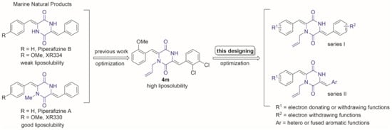 In our previous study, compound 4m showed good anticancer activities against several cell lines, including the A549 and Hela cell lines [13]. An allyl group was introduced to the 1-nitrogen atom of the 2,5-DKP ring to interrupt the formation of the intermolecular hydrogen bonds. Compared to the methyl group, this function with a little longer side chain could also disturb the π–π stacking interactions between the layers of the frameworks, which then contribute to the good lipophilicities of the derivatives. On the other hand, the biological results showed that the 2-methoxy group (2-OMe) on the phenyl ring at the 6 position of the 2,5-DKP ring played a critical role in improving the anticancer activity, whereas the impacts of its two chlorine atoms and some other strong electron-withdrawing groups (e.g., NO2, CF3, and CN) on the anticancer activities of derivatives have not been clearly investigated, as electron properties sometimes exhibit significant (positive or negative) impacts on a derivative’s bioactivity [25,26]. Similarly, the size or skeleton of the substituent will also have different influences on the anticancer activities of derivatives [7,27]. Therefore, based on the marine natural products piperafizine B and XR334, in this context, a small library of novel 2,5-DKPs was designed as follows (Scheme 1): (1) similar to compound 4m, the allyl group on the 1-nitrogen atom was retained; (2) the electron-withdrawing groups, such as NO2, CN, CF3, Br, Cl, and F on the phenyl group (series I), and the electron donating group OMe on benzene (series I or II) or naphthalene (series II) were introduced; and (3) a few electron-rich (e.g., furan and thiophene), electron-deficient (e.g., pyridine) heteroaromatic scaffolds, or fused naphthyl or quinolyl functions (series II) were employed. Thus, fourteen novel 2,5-DKPs (1, 2, 4–6, 8–16), along with two known ones (3 and 7), were designed and synthesized, and their anticancer activities against two cell lines, A549 and Hela, were evaluated aiming at the discovery of highly active anticancer agents.