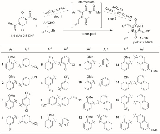 By following our previously reported procedure [28], the compounds were synthesized using a one-pot operation (Scheme 2). For the synthesis of compounds 1–5 and 8–16, in the first step, after the reaction of 1,4-diAc-2,5-diketopiperazine with the corresponding aldehyde and allyl bromide under base conditions at room temperature to yield the intermediate, another corresponding aldehyde was added directly in the second step, and the reaction was subsequently heated under base conditions until the disappearance of the intermediate. Of note is that the base additive used in two steps can be added together in the first step. The syntheses of compounds 6 and 7 were similar to the above procedure, whereas the corresponding aldehydes were added just once at the first step. The products have low to moderate yields ranging from 21 to 67%.