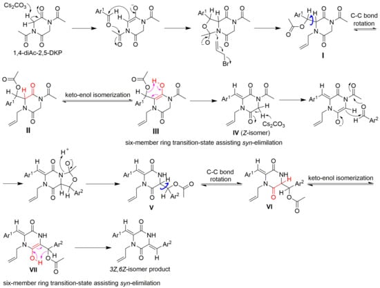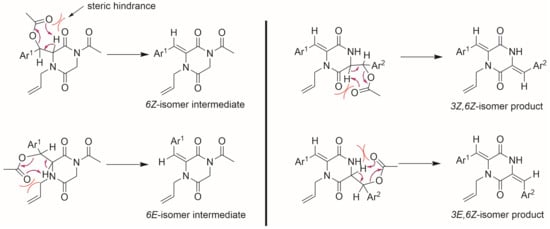 A proposed mechanism for the selective formation of this kind of product with a 3Z,6Z configuration is as follows (Scheme 3). Firstly, 1,4-diAc-2,5-DKP reacts with Ar1CHO to afford the key intermediate I, which then forms intermediate II via the C–C bond rotation. Through a keto-enol isomerization, II will become intermediate III and subsequently yield intermediate IV (Z-isomer) via a syn-elimilation promoted by an intramolecular six-member ring transition state. Next, IV reacts with Ar2CHO to give intermediate V, and this key intermediate forms the final 3Z,6Z-2,5-DKPs via a sequential transformation similar to those following intermediate I. Surely, the formation of 6Z or 6E intermediates and 3Z,6Z- or 3E,6Z-2,5-DKPs following a Chugaev-like elimination might be prevented due to steric hindrance (Scheme 4).