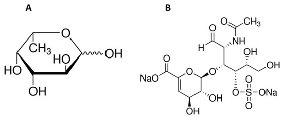 Water, a source of life on Earth and essential for all living organisms, also represents the origin of biologically active chemicals which are incredibly valuable for the pharmaceutical industry. Marine organisms are a source of many ingredients which have various useful roles in maintaining health. They can be applied in the fight against reactive oxygen species (ROS) [13,14,15,16,17] and in the treatment or prevention of infectious diseases [18,19,20,21], cancer diseases [22,23,24,25,26], diabetes [27,28], and obesity [29,30,31], as well as cardiovascular illnesses caused by hypertension [32,33]. Marine-derived compounds are used to produce drugs, pharmaceuticals, and supplements, as well as cosmetics. Various bioactive extracts from marine plants and animals are used in cosmetics acting as photo-aging inhibitors [34,35,36], skin whitening agents [37,38,39], or antiacne agents [40]. Some of these valuable ingredients are not found outside the marine environment. An example of such a group of compounds might be fucose-containing sulfated polysaccharides, with the best-known representative fucoidan. Fucoidans can be characterized by variability in chemical structure, dependent on the source, season, or plant maturity, but L-fucose (Figure 1A) is always the main component and may exceed 90% of the total fucoidan sugar composition [41]. Marine sulphated polysaccharide naturally occur in brown algae (Phaeophyta) and seawater invertebrates such as echinoderms (sea urchins and cucumbers) (class Echinoidea and Holothuroidea). The sea cucumber is also a source of another compound that occurs exclusively in the marine environment—fucosylated chondroitin sulfate [42]. This compound belongs to the glycosaminoglycan group and has the same backbone as mammalian chondroitin sulfate (D-glucuronic acid and N-acetyl-D-galactosamine; Figure 1B) but is distinguished by the presence of sulfated L-fucose [43]. This unusual sugar, characterized by the lack of a hydroxyl group on the 6-position carbon and the L-configuration, occurs in nature in tiny amounts and can be found in humans, bacteria, plants, and fungi [44,45]. L-fucose is a major component of human milk oligosaccharides and can also be found in mucin glycoproteins and glycolipids [44,46,47].